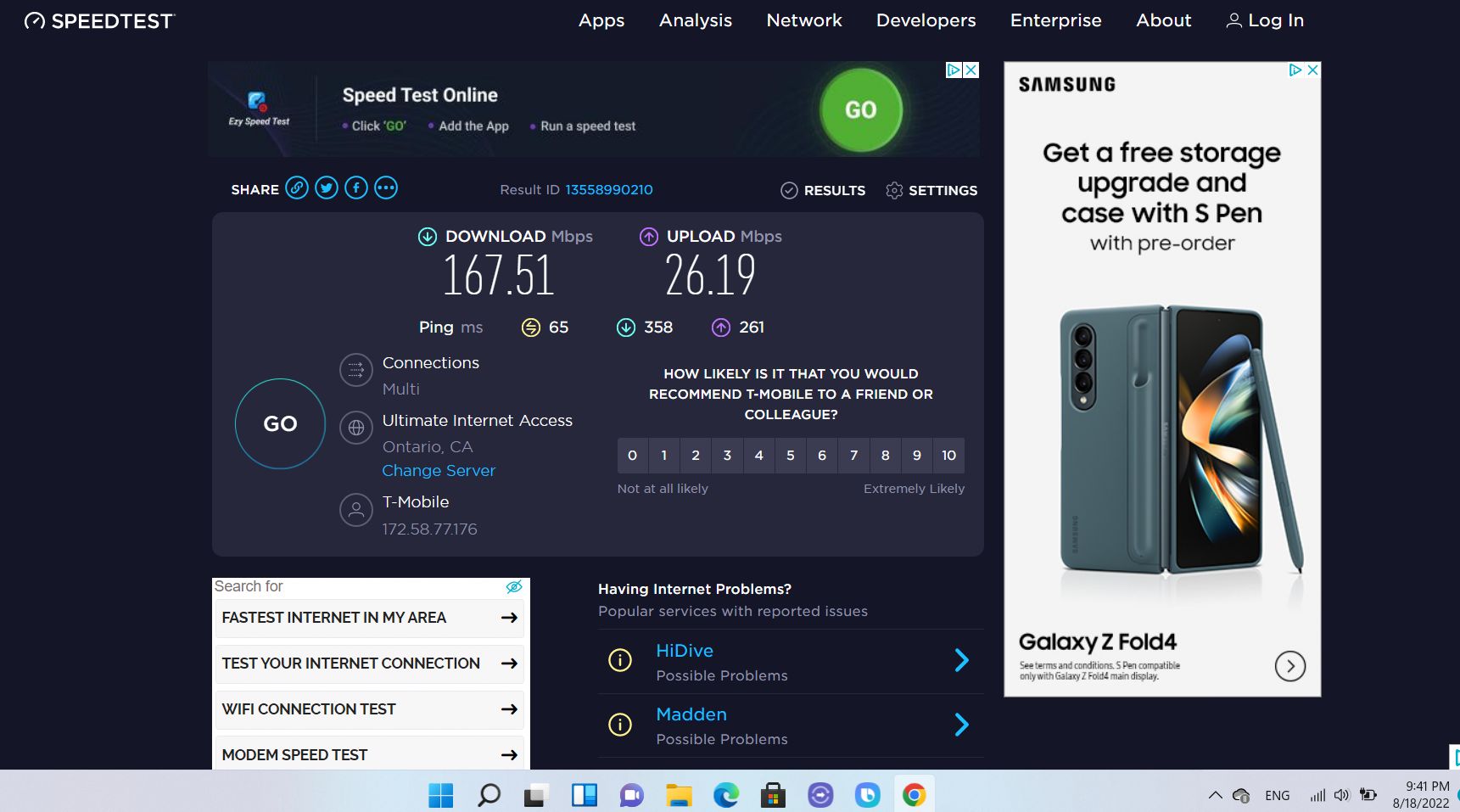 다운로드 167.51MB , 업로드 26.19MB. T-Mobile 5G는 초고속입니다!