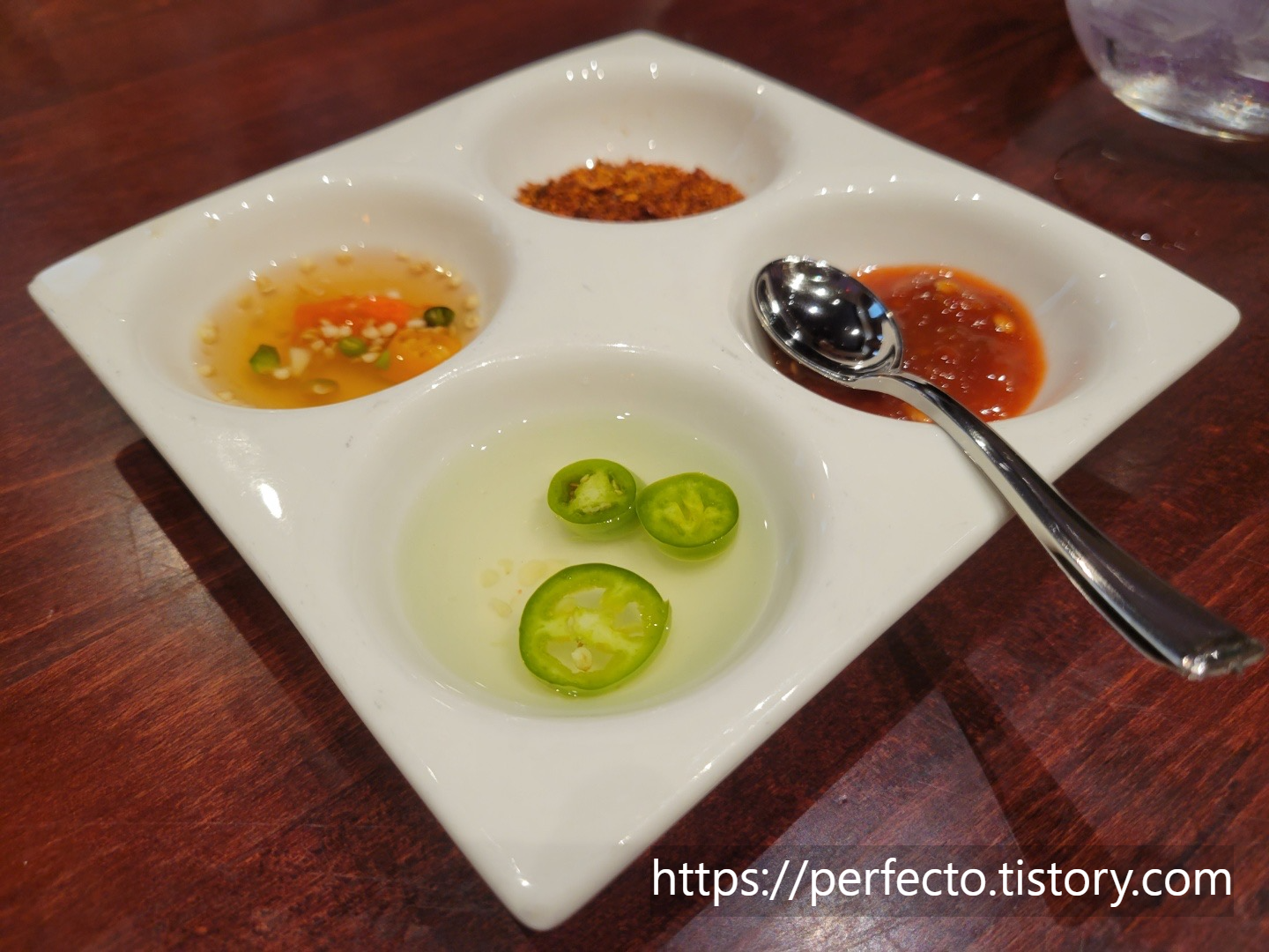 사진의 핫소스 종류도 맛있고, 매콤한걸 좋아하는 분이라면 할라피뇨도 정말 맛있습니다. 입맛을 돋우어 주는!!! 모든 국적 음식 불문하고 태국레스토랑 로터스오브시암(Lotus of Siam)추천합니다.