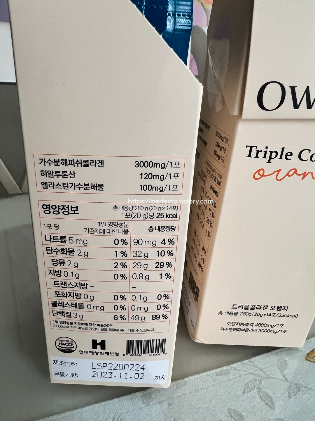오니스트 트리플 콜라겐은 화학부형제, 감미료, 방부제, 합성착향료가 들어가 있지 않으며 유통기한 또한 1년 넘게 넉넉합니다.