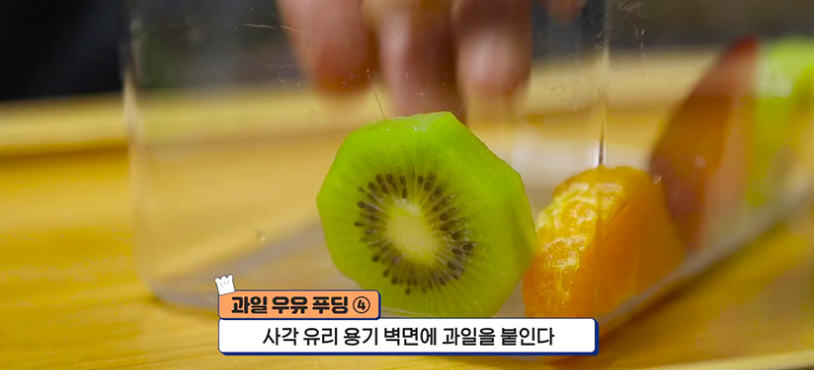 4. 사각 유리 용기 벽면에 과일을 붙입니다.
