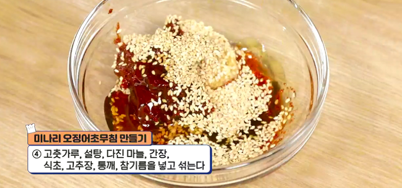 4. 양념장 만들기 : 고춧가루, 다진 마늘, 설탕, 간장, 식초, 고추장, 통깨, 참기름을 넣고 섞는다.