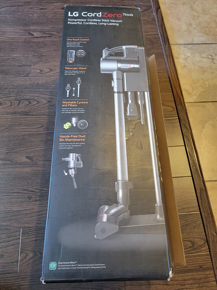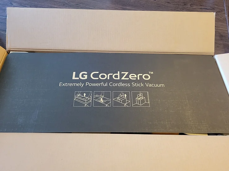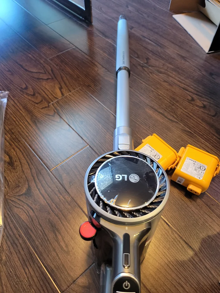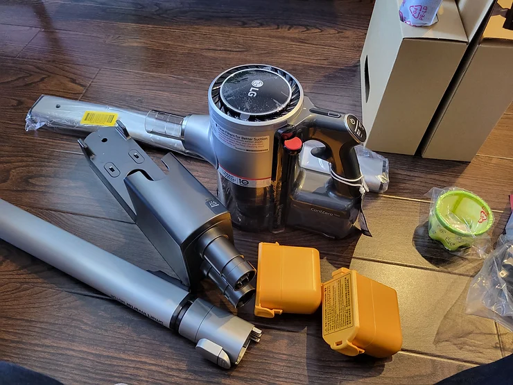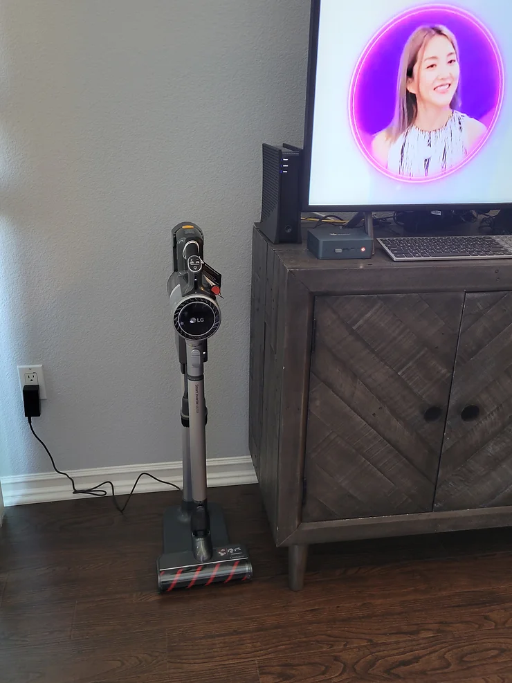 Once I was almost done putting the unit together, Hello! What do I see? The LG CordZero vacuum has a telescoping tube! Wow! LG really put a lot of thought into this Dyson competitor. It doesn't stop here. It even comes with a well built charging cradle. The stand holds your vacuum, charges both batteries, and holds your extra add-ons. Some may ask what the big deal is about a stand? There are a lot of people out there that do not like to make holes in their walls. So for example, 1 of our Dyson V8's are mounted on the wall. On the other hand one isn't, and it just sort of leans on corner, and does not look clean at all. Especially since we have to charge it this way. Look at the picture below. I must say, the LG CordZero Stand is a GREAT feature.